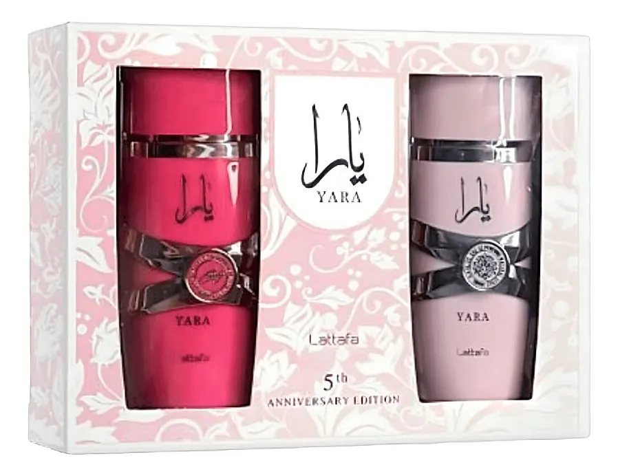 SET LATTAFA WOMAN YARA & YARA CANDY 5th ANNIVERSARY EDITION 2x100ml Set yara edición limitada, lanzado por motivos de su celebración del 5to aniversario, ideal para un detalle especial. Yara EDP Spray 100 ml: Esta fragancia se abre con delicadas notas florales de heliotropo y orquídea, realzadas por el brillo cítrico de la mandarina. En el corazón, un delicioso acorde gourmand se combina a la perfección con frutas tropicales exóticas, agregando un toque dulce y divertido. La base de vainilla cálida, sándalo suave y almizcle suave crea un final reconfortante y duradero. Perfecto para quienes disfrutan de un aroma dulce y tropical con una calidez lujosa y cremosa.